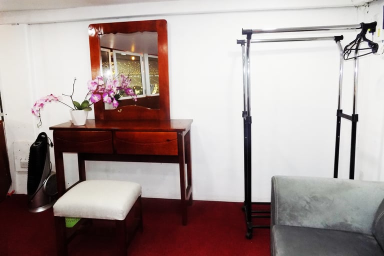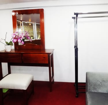 En nuestro jardín de eventos contamos con un camerino privado, ubicado a unos pasos de la pista de baile, pensado para que realices tus cambios de ropa con total comodidad. El espacio está equipado con sofá, tocador con espejo y perchero, para que tengas todo a la mano y no te pierdas ni un instante de la celebración. Limpio, práctico y cercano: ideal para novias, quinceañeras e invitados.