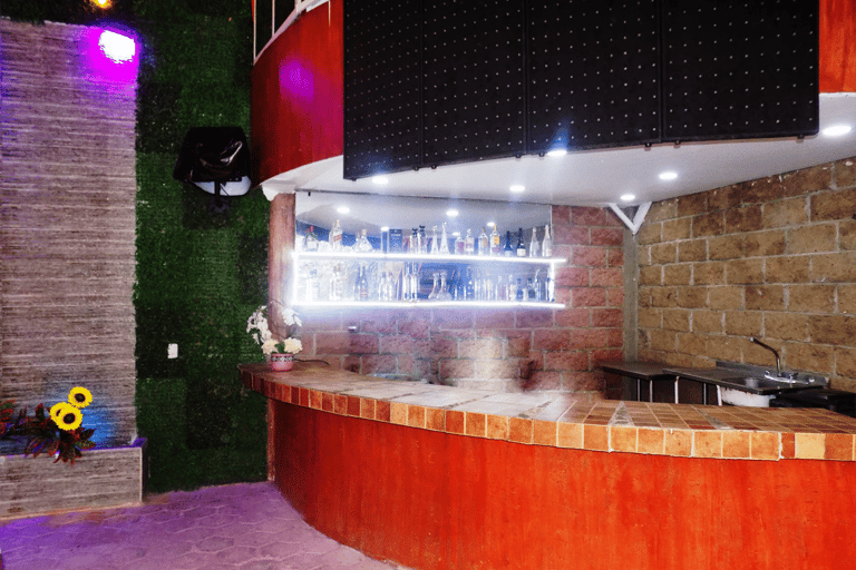 Además, contamos con una barra de bar completamente equipada, con área de trabajo amplia, hieleras, cristalería y refrigeración para mantener todo bien frío. Es el punto ideal para preparar bebidas y cocteles al momento—desde cervezas y vinos hasta mezclas especiales—asegurando un servicio ágil y elegante durante todo tu evento.